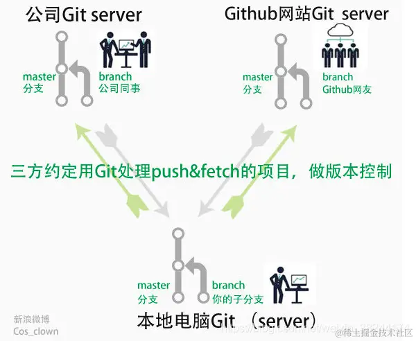 一言以蔽之, 所谓Git,一款免费、开源的分布式版本控制系统;所谓Github,用Git做版本控制的代码托管平台。一张图来说明代码提交者、Git与Github之间的关系: