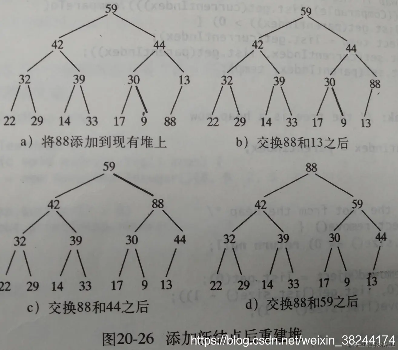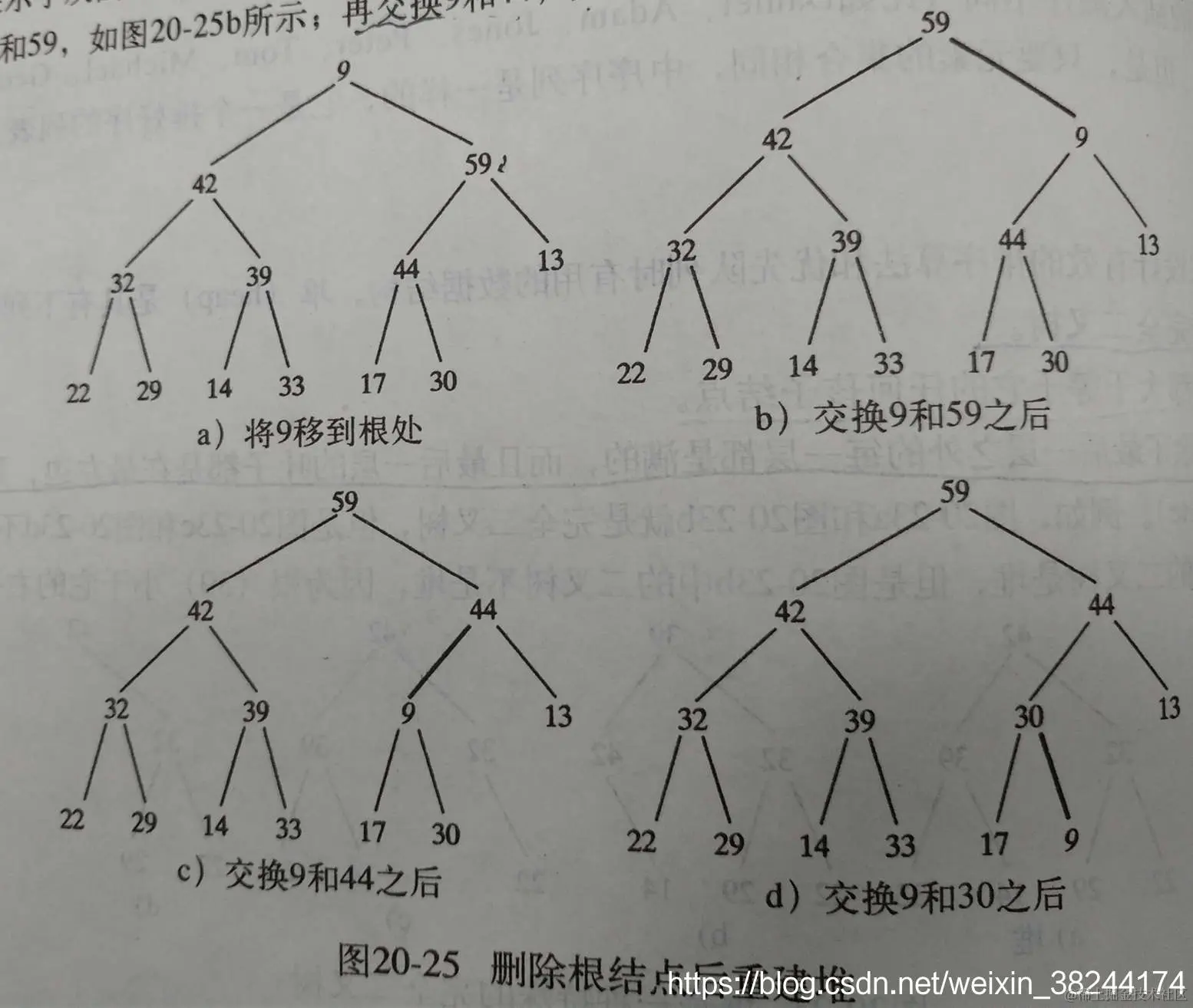 注意删除后,必须保持堆得特征。譬如下图的删除结点62以后的重建堆过程。(1)先将最右下角(最后)一个节点(9)放在根处,(2)然后交换9和59,与第二层中的最大值进行交换。(3)依次类推,重建了堆。