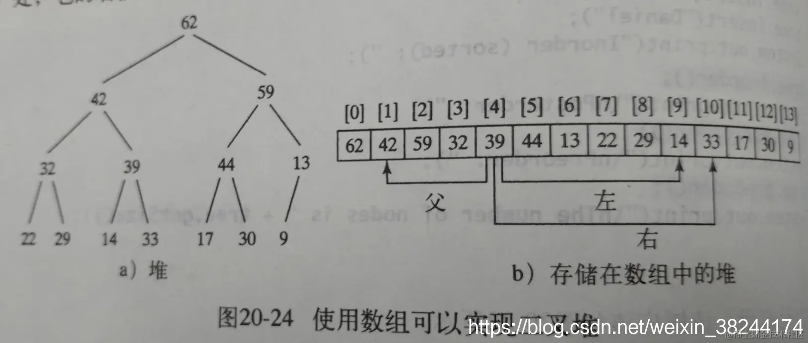 可以使用二叉树表示堆,但如果预先不知道堆的大小,那么使用数组或数组线性表也是一个不错的选择。此时,对位置i处的结点,它的左孩子位于位置2i+1处,它的右孩子在2i+2处,它的父亲在(i-1/2)处。譬如下图:39结点在位置4处,它的左孩子在9,它的右孩子在10处,它的父亲在1处。