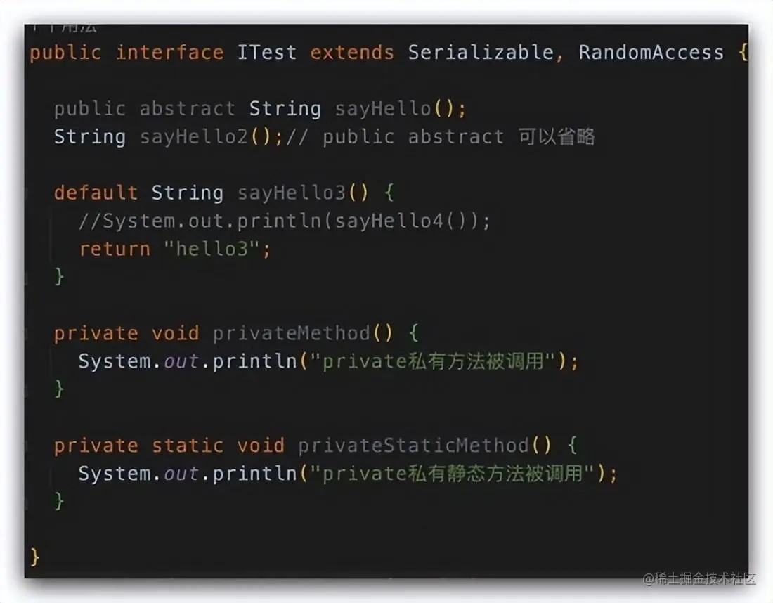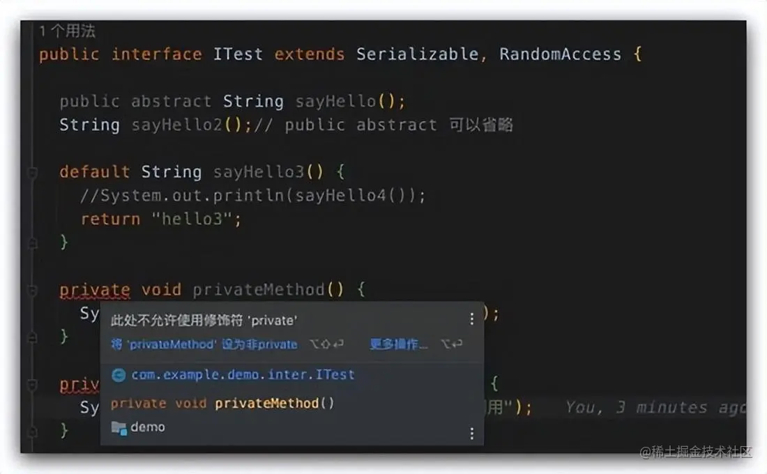 大家有没有注意到,上面不管是默认方法还是静态方法其实都是 public 公开的,可以让实现类或者其他类直接使用,那有没有可能在接口中定义一个私有方法呢?在 JDK 9 之前是不可以的,JDK 9 却支持了,如下所示