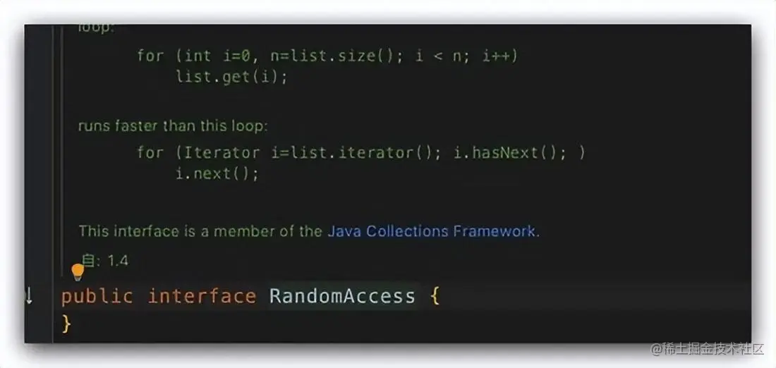 通过源码我们可以知道 RandomAccess 是用来标识子类是否实现了该接口,如果实现了则走实现了的逻辑,没有实现就走没有实现的逻辑,所以我们在日常开发中也可以利用这个特性,当我们有不同的子类需要根据情况进行不同的实现逻辑的时候就可以采用定义一个空接口来标记一下,方便后面的处理。