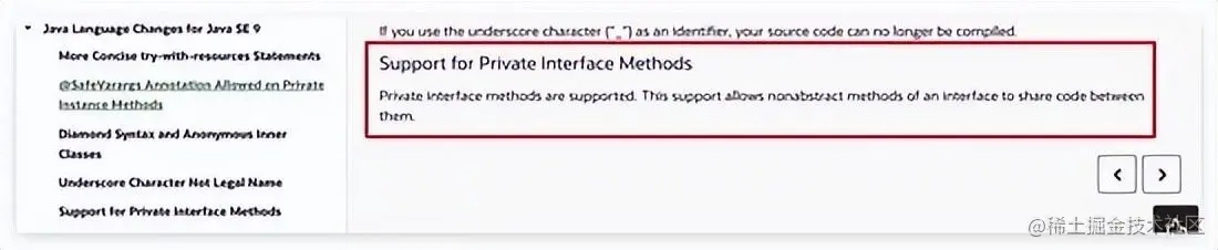 从官方的文档中我们可以找到下面的描述,在 JDK 9 中接口支持私有方法,主要用于不同的非抽象方法中共享代码。