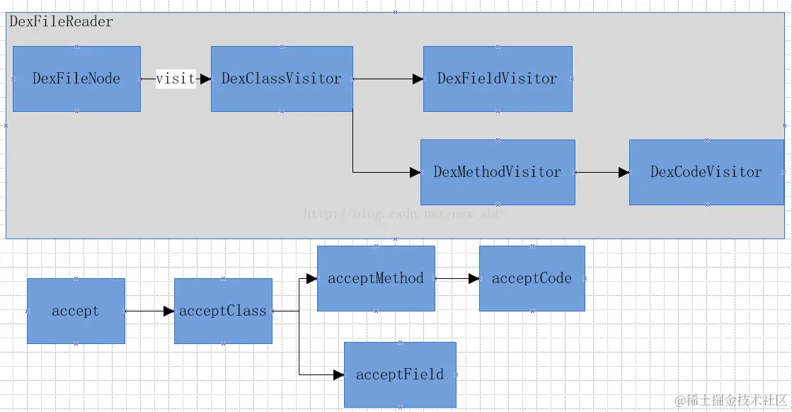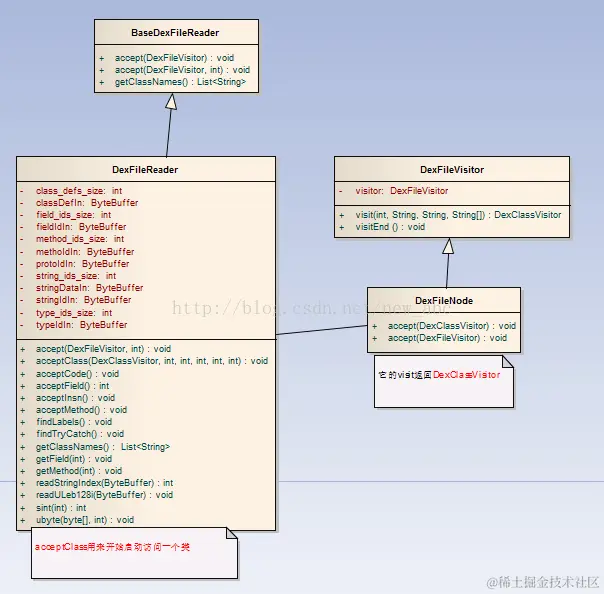 DexFileReader开始从dex文件中读取内容,并调用里面的相应的函数处理读取到的数据,如acceptClass会解析一个类等