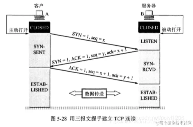 5.TCP客户进程收到B的确认后,还要向B给出确认。确认报文段的ACK置1,确认号ack = y +? 1,而自己的序号seq = x + 1。这时ACK报文段可以携带数据。但如果不携带数据则不消耗序号,这种情况下,下一个数据报文段的序号仍是seq = x + 1。这时,TCP连接已经建立,A进入ESTABLISHED(已建立连接)状态。