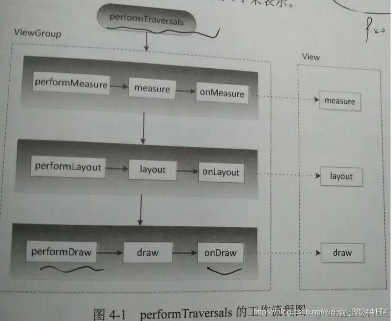 View的绘制流程:从ViewRoot的perfromTraversals方法开始,他通过measure,layout和draw三个过程才能将View画出来,measure测量view宽高,layout确定view在父容器的位置,draw将view绘制在屏幕上。依次调用perfromMeasure,perfromLayout,perfromDraw,他们分别完成顶级View的measure,layout和draw。