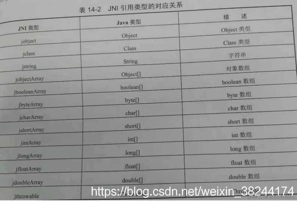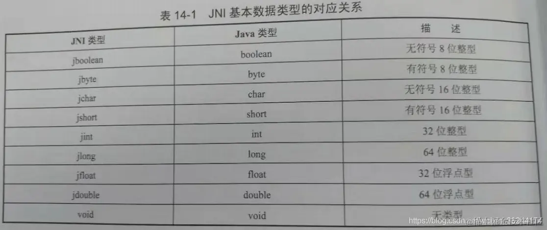 JNI的数据类型主要有两种:基本类型和引用类型。基本类型为jboolean、jchar、jint等,它们和java中的类型一一对应。JNI中的引用类型包括类、对象和数组。