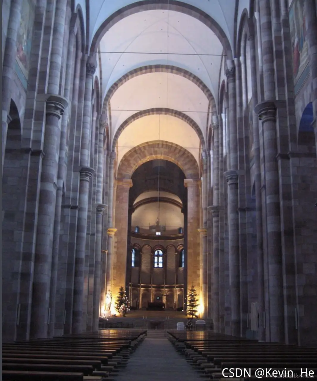 古希腊建筑讲究“支撑”,而中世纪基督教堂建筑则讲究“围挡”。教堂建筑的表现重点亦在内部,内部空间中尤为重要的是中殿,这是信徒做弥撒的区域。