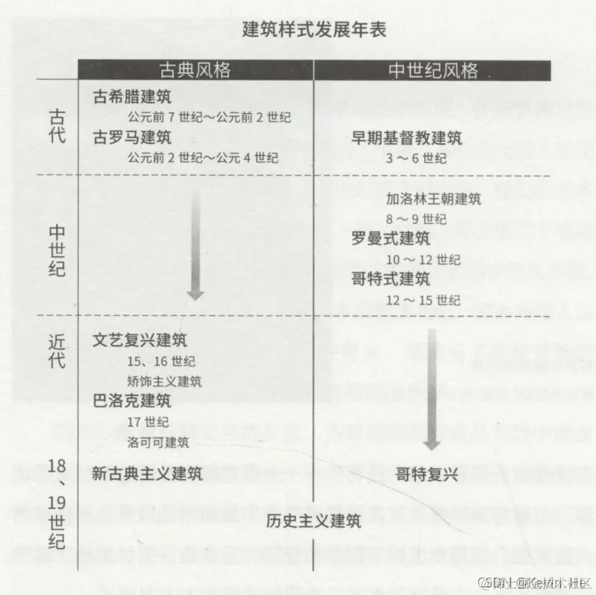 一言以蔽之,古希腊建筑三种柱式;古罗马建筑五种柱式;文艺复兴建筑更注重“比例”和“协调”;巴洛克建筑强调动态柱式表现形式;罗曼式建筑讲究“墙面分节”;哥特式建筑特点是无重量感;哥特复兴时期的建筑推崇浪漫主义。