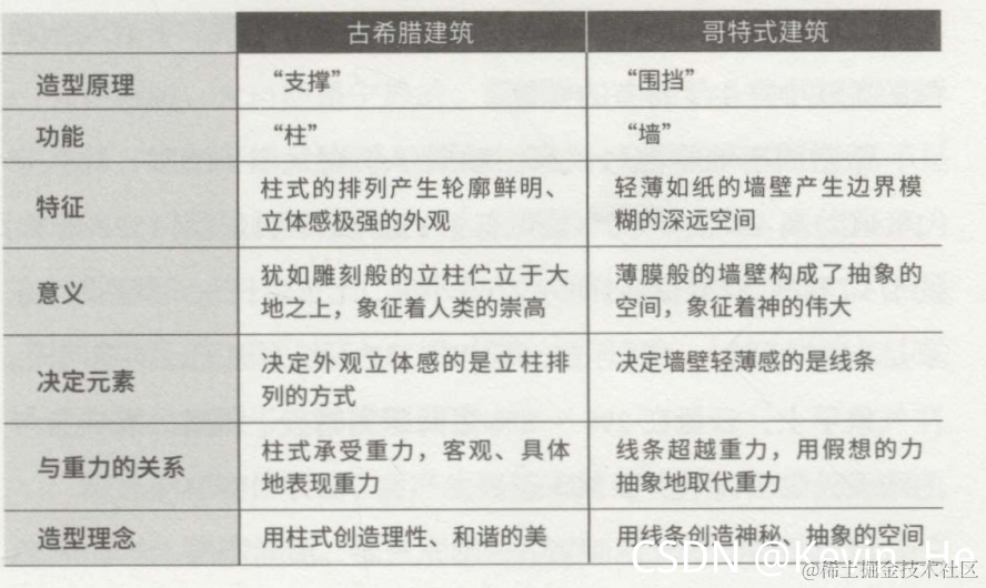 “围挡”和“支撑”的外在表现是“墙”和“柱”,如果柱子间隔排列,也会产生围挡的效果,但笔者在这里只探讨一根柱子和一面墙给人的感觉。古典建筑体系【比如古希腊式建筑】采用了“柱”式造型理论,中世纪建筑体系【比如哥特式建筑】采用了“墙”式造型理论。以立柱为中心、把从地面到屋檐的所有部分组合起来的样式叫做柱式;薄膜般的墙壁营造出的抽象的内部空间叫做墙式。