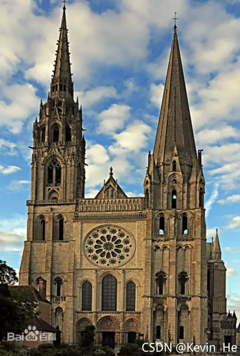 哥特式建筑起源于法国,是罗曼式建筑的延续,但分节手法有着本质的不同。革新的本质是墙壁的分割都由柱身或小圆柱、凹型装饰等又圆又细又长的线性元素组成。哥特式建筑的特点是无重量感(消除边缘、减少墙壁厚度和扩大开口部)、聚焦于教堂,光怪陆离彩色窗户和飞扶壁。代表作有沙特尔大教堂、兰斯大教堂等。