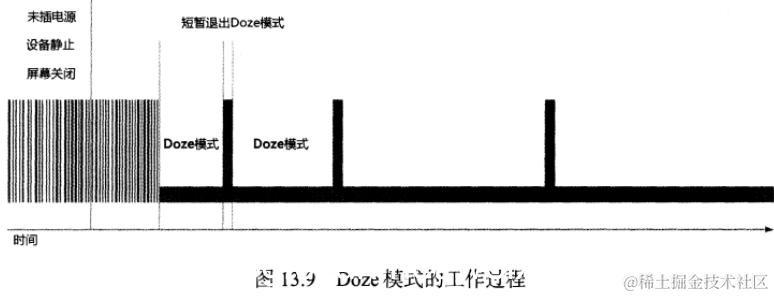 Android6.0之后加入,未插电源、处于静止状态、屏幕关闭一段时间。自动进入Doze模式。此时,系统对CPU、网络、Alarm活动进行限制。延长电池寿命。系统不会一直处于Doze模式下,会间歇性的退出Doze模式去处理同步操作、Alarm任务等。工作过程如下图所示: