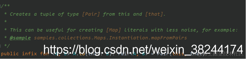 to并不是Kotlin关键字,借助了高级语法糖:infix函数,infix只是调整了写法,他是将A .to( B)改为A to B。Infix可提高代码的可读性。举例来讲:
