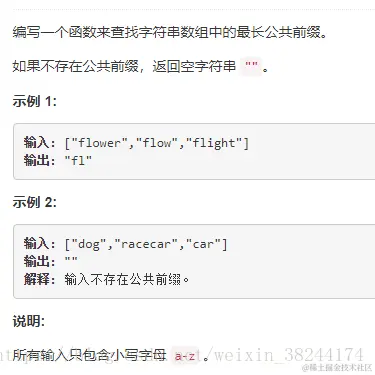 解题思路一:(1)先找到最小字符串的长度,然后记录下来;(2)以最小长度为外层循环。以数组长度为内层循环,进行遍历,若该位前者等于后者,则累加字符串,并对比第二个和第三个字符串的第一位。若不等,则break,设置flag,告诉系统结束了;若最后一个字符串等于数组长度,则对比下一位。(第一次提交时未考虑到:若数组长度为空,则返回空字符串;若长度为1,则返回第一个数组的全部字符串)。