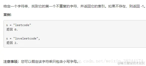 解题思路二:别人的方法:比我的方法快十倍,思路比较清奇,主要是遍历a-z的元素,记录其第一次出现的位置和最后出现一次的位置是否相同,若相同,则说明只出现了一次,记录该点位置,有更小的位置则对其不断进行更新。若不同,则不用处理。最后判定如果全部相等的话就将其置为-1。