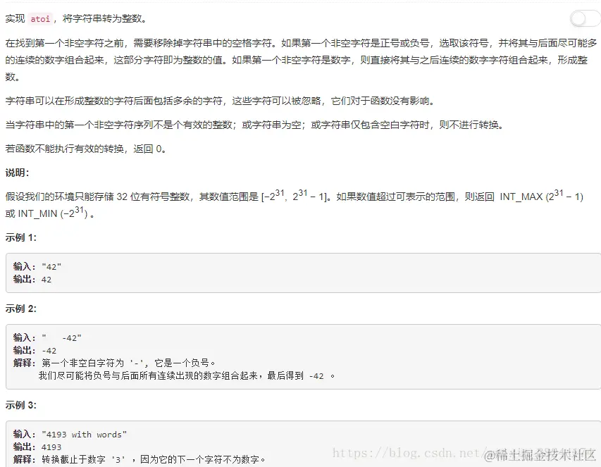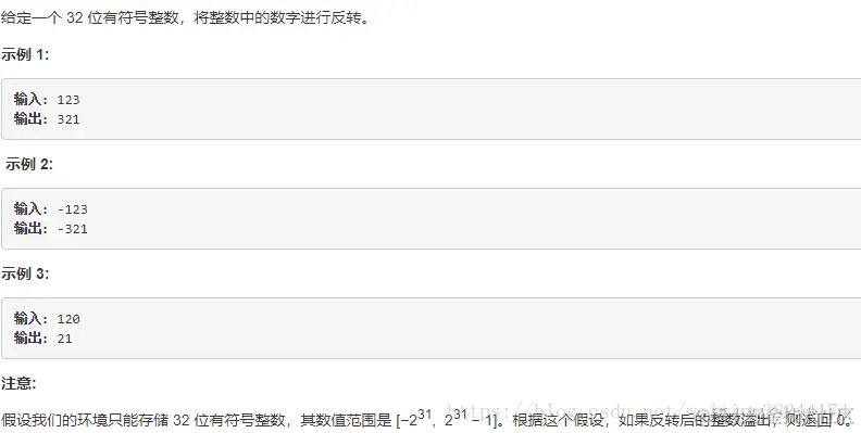 解题思路:这个题当时还挺麻烦的,注重细节太多。因为StringBuilder和StringBuffer的对象是变量,对变量进行操作就是直接对该对象进行更改,而不进行创建和回收的操作。故而使用StringBuilder来搞定。步骤如下:(1)判断数字是否大于零,若小于零,则从下标为1开始截取字符串;(2)使用result +=(Math.pow(10,i)*tmp);tmp为正向读取到的每个元素;result为long类型。(3)判断其是否大于Integer.MAX_VALUE或者小于Integer.MIN_VALUE,返回相应的值。注意以下几点:(1)MAth.abs不能用;(2)Integer.MAX_VALUE判断最大值;(3)判断反转之后的有没有越界,而不是之前的有没有越界。