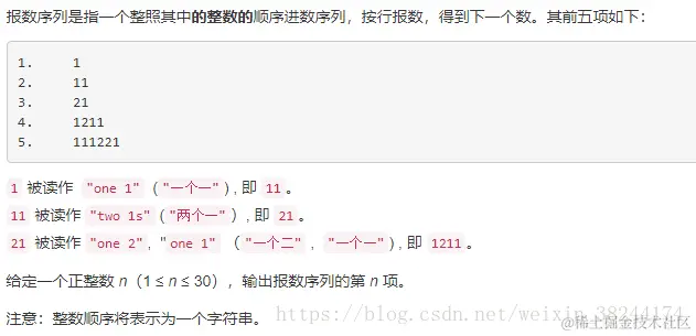 解题思路一:这个题应该划归到medium里面,光理解题意都得小半会。1.先对字符串Stringbuilder进行分割,设置begin下标位置为0,(1)若字符串中的字符前者不等于后者,则统计begin下标到该处的位置和字符,放进ArrayList中(Arraylist里面存了数字和重复次数),更新begin的值;(2)若到了字符串的结束位置,也将其存储进去。 2.更新Stringbuilder内容,计算时候一定要细心,重复n-1次。