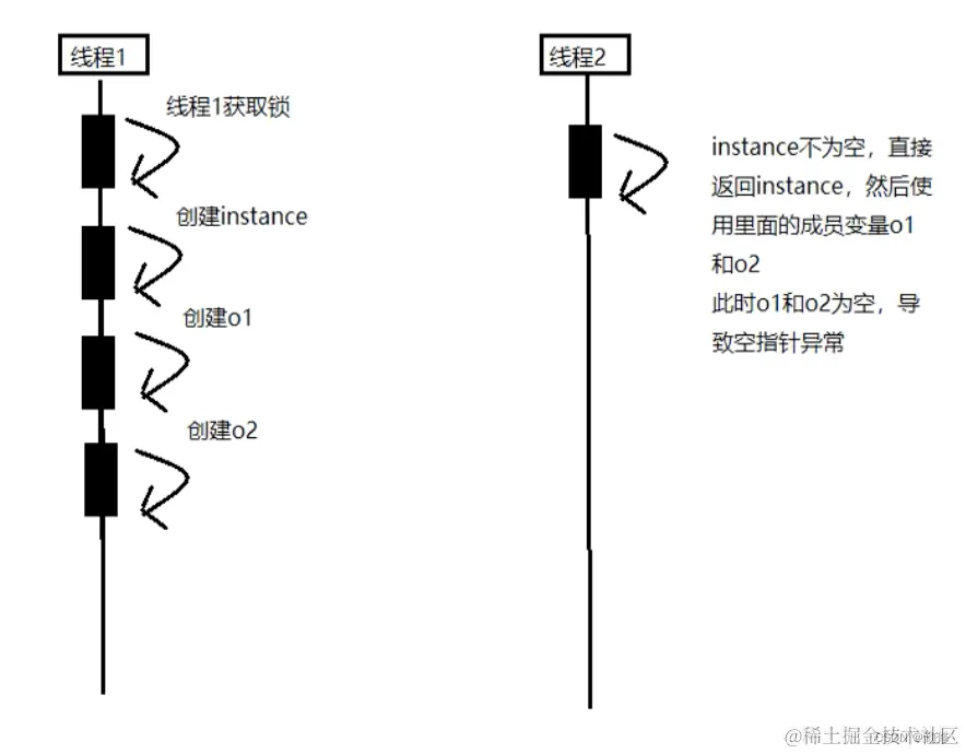 * 缺点:可能因为指令重排序,o1和o2会出现空指针异常。(不能实现功能,可能会出现空指针异常)
