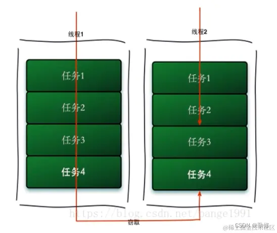 该算法是指某个线程从其他队列里窃取任务来执行。一个任务分割为若干互不依赖子任务,为了减少线程竞争,将子任务分别放到不同队列中,并为每个队列创建一单独线程执行队列任务,双端队列来执行,当队列一执行完毕,会从队列2的尾部窃取任务执行。