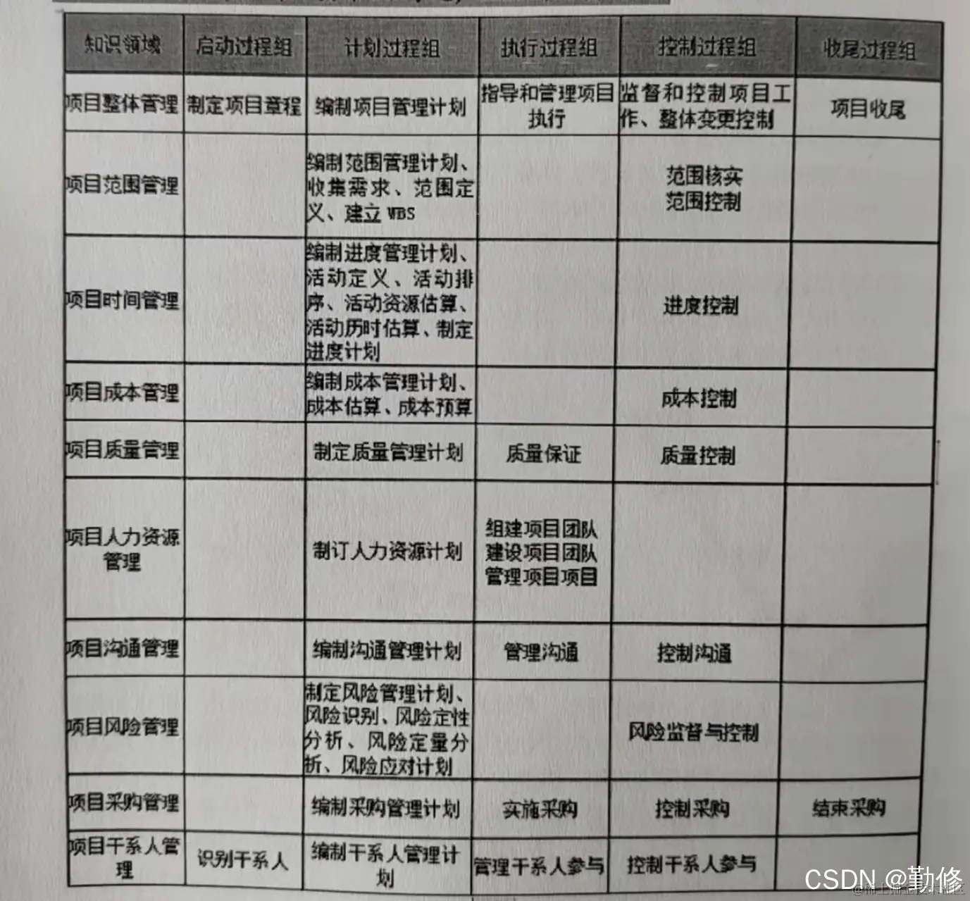 - 风险按照可预测性划分为:已知风险(概率高、后果轻微。eg:目标不清晰、原材料波动、进度风险)、可预测风险(可预见、无法预知后果。eg:机械故障、分包商未按时交工、业主未及时审查)、不可预测风险(不可预见。eg:地震、暴雨、通货膨胀、政策)