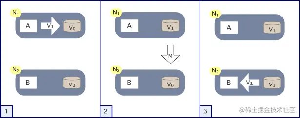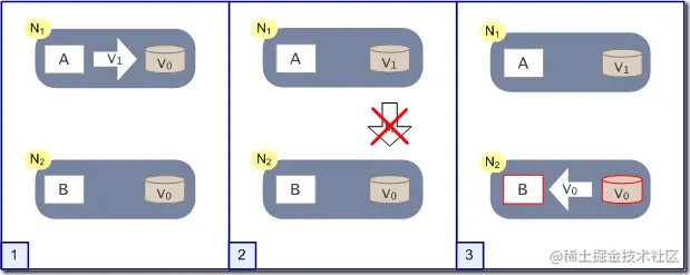 上图是分布式系统正常运转的流程,用户向N1机器请求数据更新,程序A更新数据库Vo为V1,分布式系统将数据进行同步操作M,将V1同步的N2中V0,使得N2中的数据V0也更新为V1,N2中的数据再响应N2的请求。