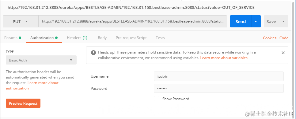 spring cloud -- eureka主动停止和恢复服务 code狼 2023-07-20 74 阅读1分钟 在我们使用springcloud开发中,由于有很多开发人员同时开发,当他们注册服务的时候,难免会将别的服务注册在我们当前的注册中心,此时我们可以主动将其服务下线 可以通过postman发送PUT请求: 服务下线: 服务上线: 详解: eureka部署的地址 固定值 对应下图的Application 对应下图Status 下线后的状态: 如果eureka有密码可以进行如下操作,在authorization中添加: