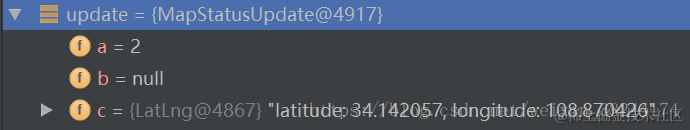 UpdateFactory.newLatLng(latlng01)获取的)里面的数据(主要指纬度、经度)。从而导致在获取自己位置缩放时经常出错。定位到默认位置的缩放。下图分别是执行MapStatusUpdateFactory.zoomTo(16f)执行前和执行后update的数据内容。