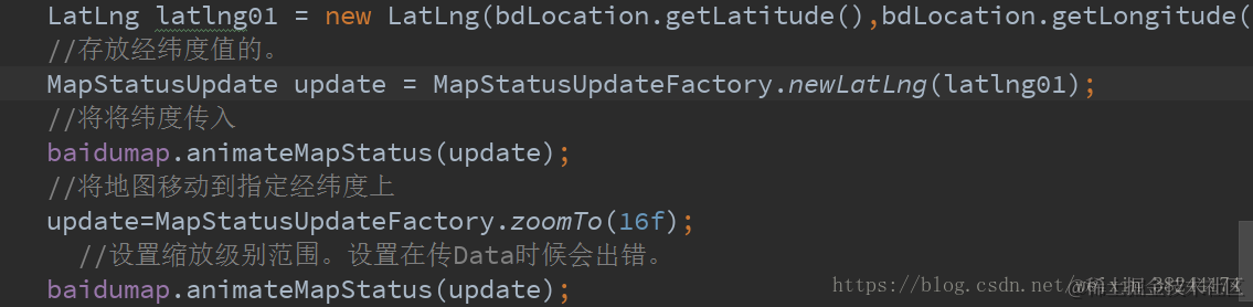 在这段代码当中,在设置缩放级别时(MapStatusUpdateFactory.zoomTo(16f))会丢失上一步update(MapStatus