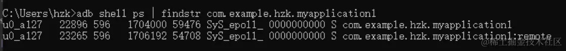 使用DDMS视图或者命令可以查看:adb shell ps | findstr com.example.hzk.myapplication1