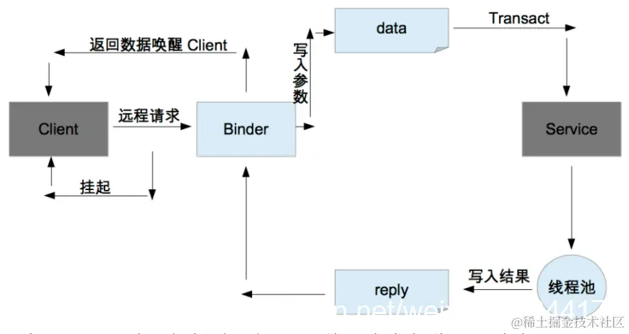 Proxy#getBookList 运行于客户端,远程调用此方法时,创建该方法所需要的输入型Parcel对象_data、输出型Parcel对象_reply和返回值对象List然后把该方法的参数信息写入_data中(如果有参数的话):接着调用transact方法来发起RPC(远程过程调用)请求,同时当前线程挂起。 直到RPC过程返回后,当前线程继续执行,并从_reply中取出RPC过程的返回结果;最后返回_reply中的数据。