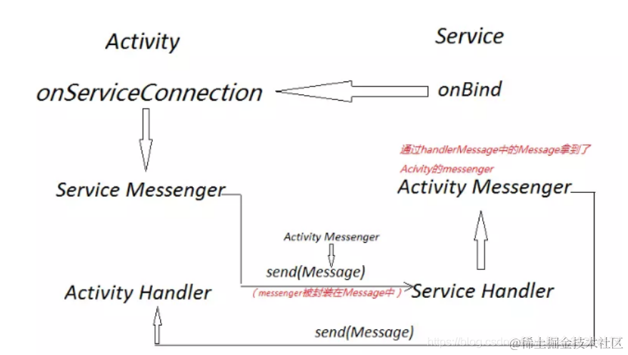 (2)在Service的onBind方法中返回Messenger的Binder对象;(3)在Activity中创建一个Handler对象,用来处理消;(4)在Activity中创建一个ServiceConnection对象,并且在onServiceConnected方法中,获取Service端的Messenger对象;(5)在Activity创建Messenger,并封装在Message中传递给Service端。