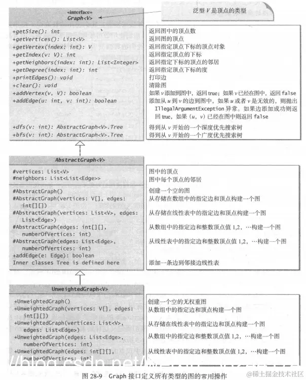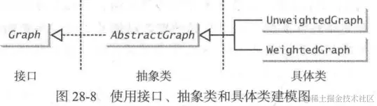我们定义Graph的接口来包含图的所有常用操作,AbstractGraph来部分实现接口,许多具体的图被添加进这一设计中。最后定义了unweightedGraph和weightedgraph。