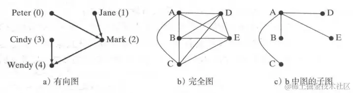 环:一条将顶点链接到它自身的边。简单图:没有环和平行边的图。完全图:每一对节点都相连的图,譬如下面这幅。