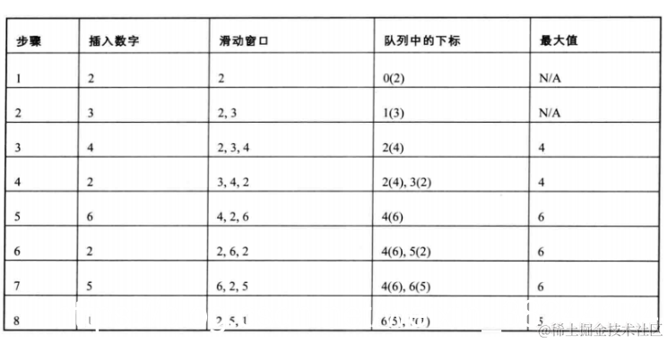 我们可以使用一个双端队列deque。我们可以用STL中的deque来实现,接下来我们以数组{2,3,4,2,6,2,5,1}为例,来细说整体思路。数组的第一个数字是2,把它存入队列中。第二个数字是3,比2大,所以2不可能是滑动窗口中的最大值,因此把2从队列里删除,再把3存入队列中。第三个数字是4,比3大,同样的删3存4。此时滑动窗口中已经有3个数字,而它的最大值4位于队列的头部。第四个数字2比4小,但是当4滑出之后它还是有可能成为最大值的,所以我们把2存入队列的尾部。下一个数字是6,比4和2都大,删4和2,存6。就这样依次进行,最大值永远位于队列的头部。但是我们怎样判断滑动窗口是否包括一个数字?应该在队列里存入数字在数组里的下标,而不是数值。当一个数字的下标与当前处理的数字的下标之差大于或者相等于滑动窗口大小时,这个数字已经从窗口中滑出,可以从队列中删除。