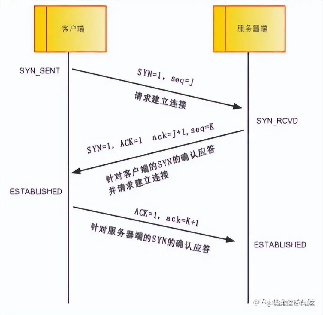 第二次握手:服务器端收到数据包后由请求报文标志位 SYN=1 知道客户端请求建立连接,服务器端将应答报文标志位 SYN 和 ACK 都置为 1,应答报文的 Acknowledgment Number字段(简称 ack)中填入 ack=J+1,应答报文的 seq 中填入一个随机值 K,并将该数据包发送给客户端以确认连接请求,服务器端进入 SYN_RCVD 状态。