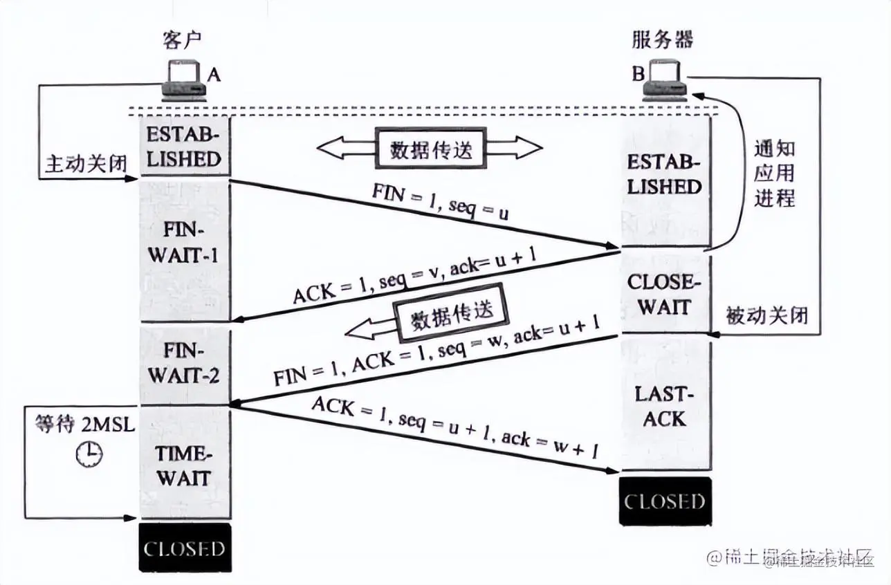 (5) 被动关闭端只要收到了客户端发出的确认,立即进入CLOSED状态。同样,撤销TCB后,就结束了这次的TCP连接。可以看到,被动关闭端结束TCP连接的时间要比主动关闭端早一些。