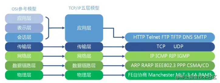 OSI 模型比较复杂且学术化,所以我们实际使用的 TCP/IP 模型,分 5 层:物理层、数据链路层(也有 TCP/IP 模型将物理层、数据链路层合称为网络接口层,与之对应的,协议就被称为 TCP/IP 四层协议模型)、网络层、传输层、应用层。 两个模型之间的对应关系如图所示: