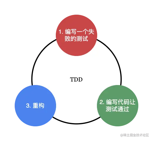 测试驱动开发(Test-Driven Development)将测试的重要性推到了极致。在其开发流程中,开发者首先要做的就是编写一个失败的测试。TDD 核心开发流程为:红-绿-重构。如下图: