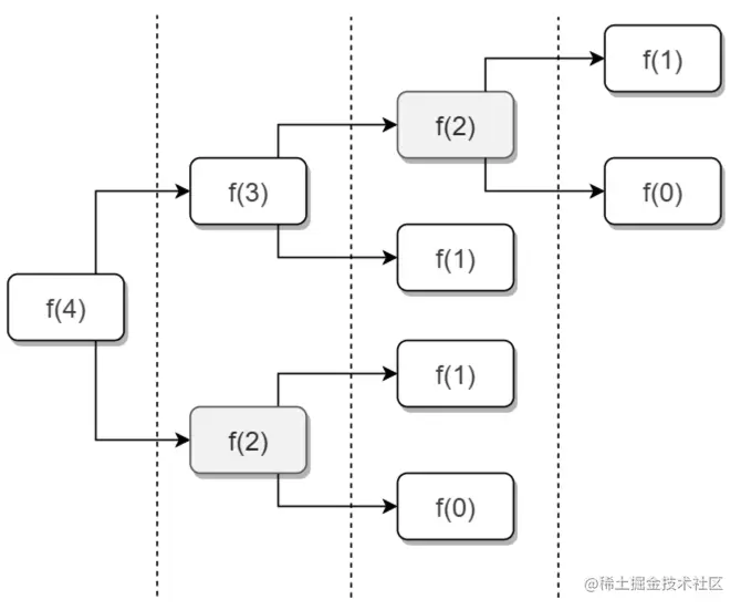 如果使用递归求解,会重复计算一些子问题。例如,计算 f(4) 需要计算 f(3) 和 f(2),计算 f(3) 需要计算 f(2) 和 f(1),可以看到 f(2) 被重复计算了。