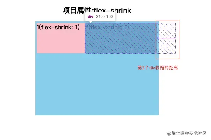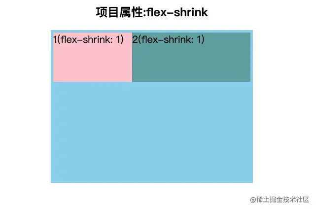 默认情况下,第一个div宽度是200,第二个div宽度是300,两个相加应该超过父元素的400,但是由于 flex-shrink 都设置为1,将两个div都收缩在父元素中