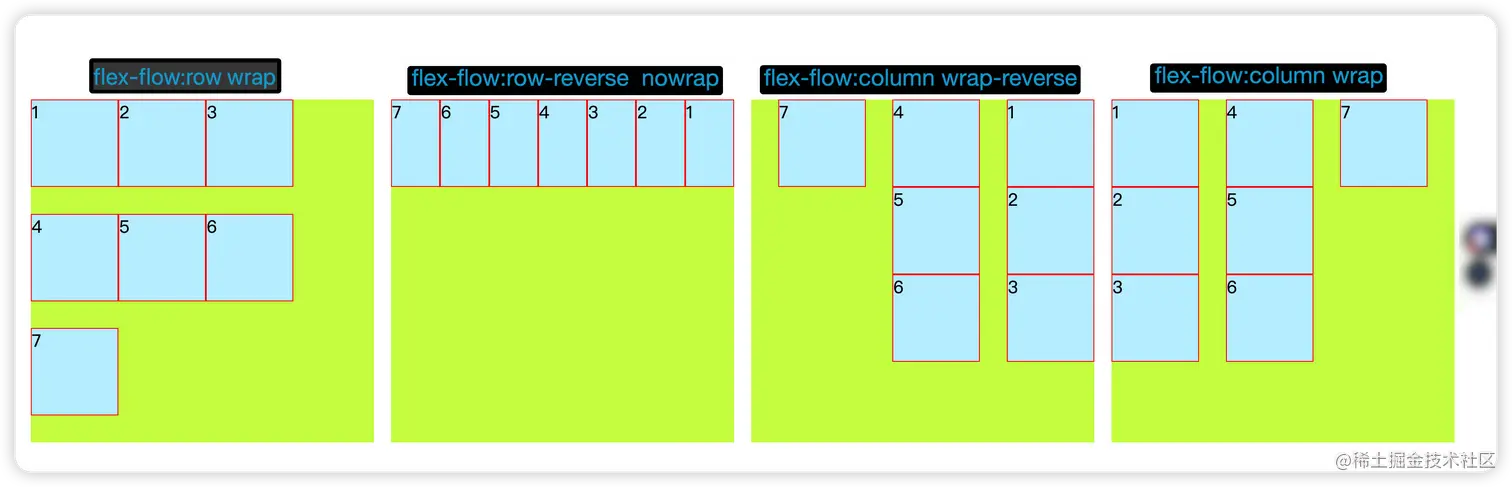 - wrap-reverse:换行,第一行在下方。