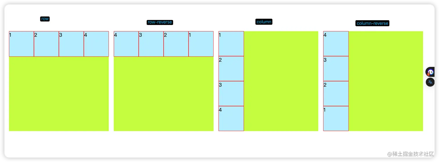 - column-reverse:主轴为垂直方向,起点在下沿。