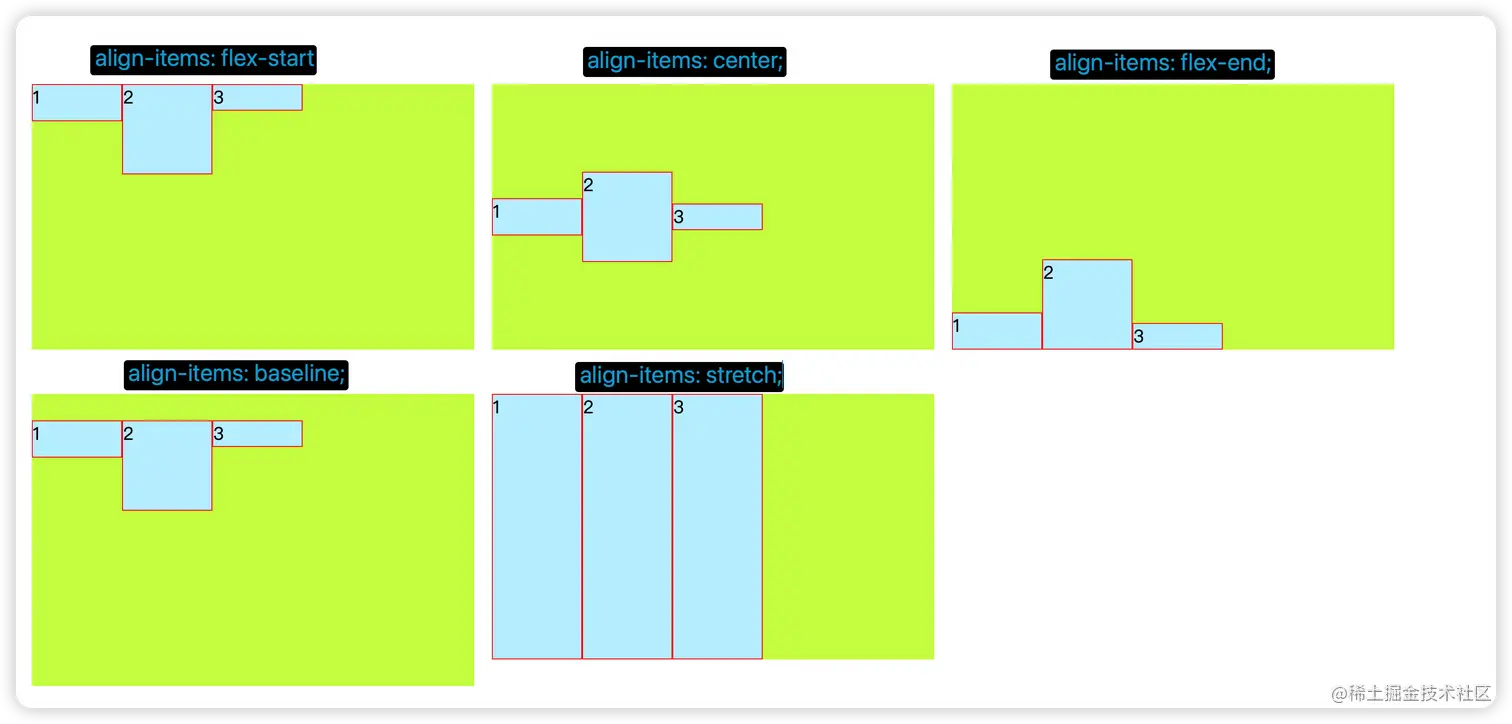 align-items: flex-start | flex-end | center | baseline | stretch;