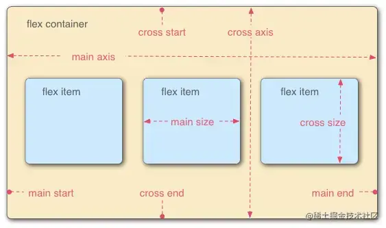 学习flex布局需要明白”主轴“与”交叉轴“的概念,采用flex布局的元素,称为”容器“ ( flex container),它的所有子元素都是容器的”项目“(flex item),容器默认存在两根轴:水平的主轴(main axis)和垂直的交叉轴(cross axis)。主轴的开始位置(与边框的交叉点)叫做 main start ,结束位置叫做 main end ;交叉轴的开始位置叫做 cross start ,结束位置叫做 cross end
