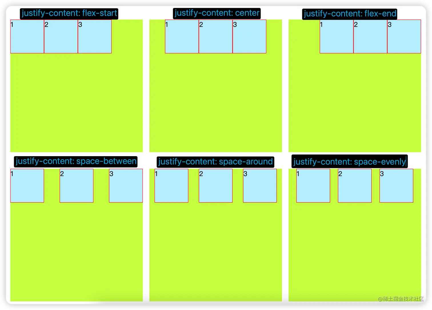 - space-evenly:每个项目的间隔与项目和容器之间的间隔是相等的。