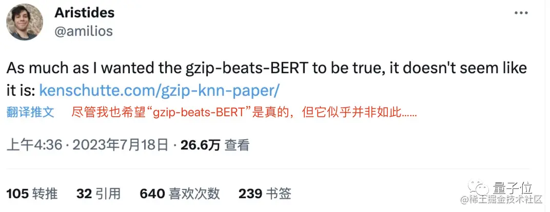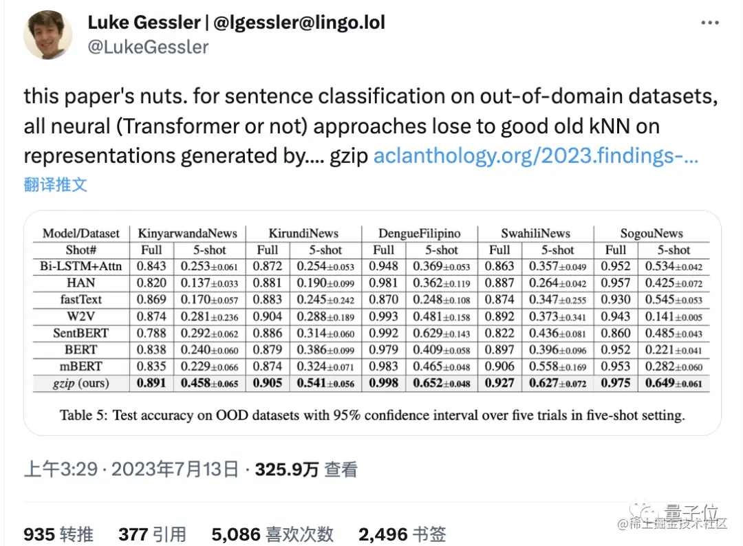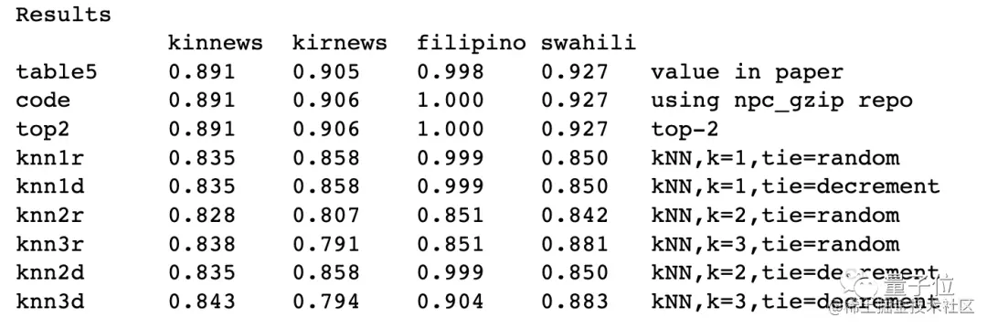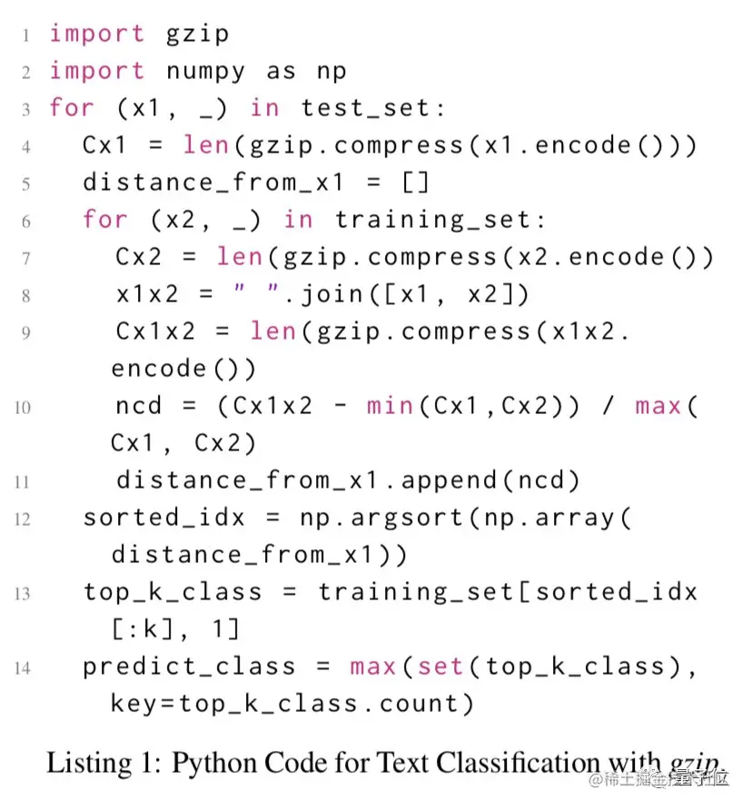 将简单的压缩算法比如gzip和k近邻分类算法进行结合来做这件事(用到了归一化压缩距离NCD)。