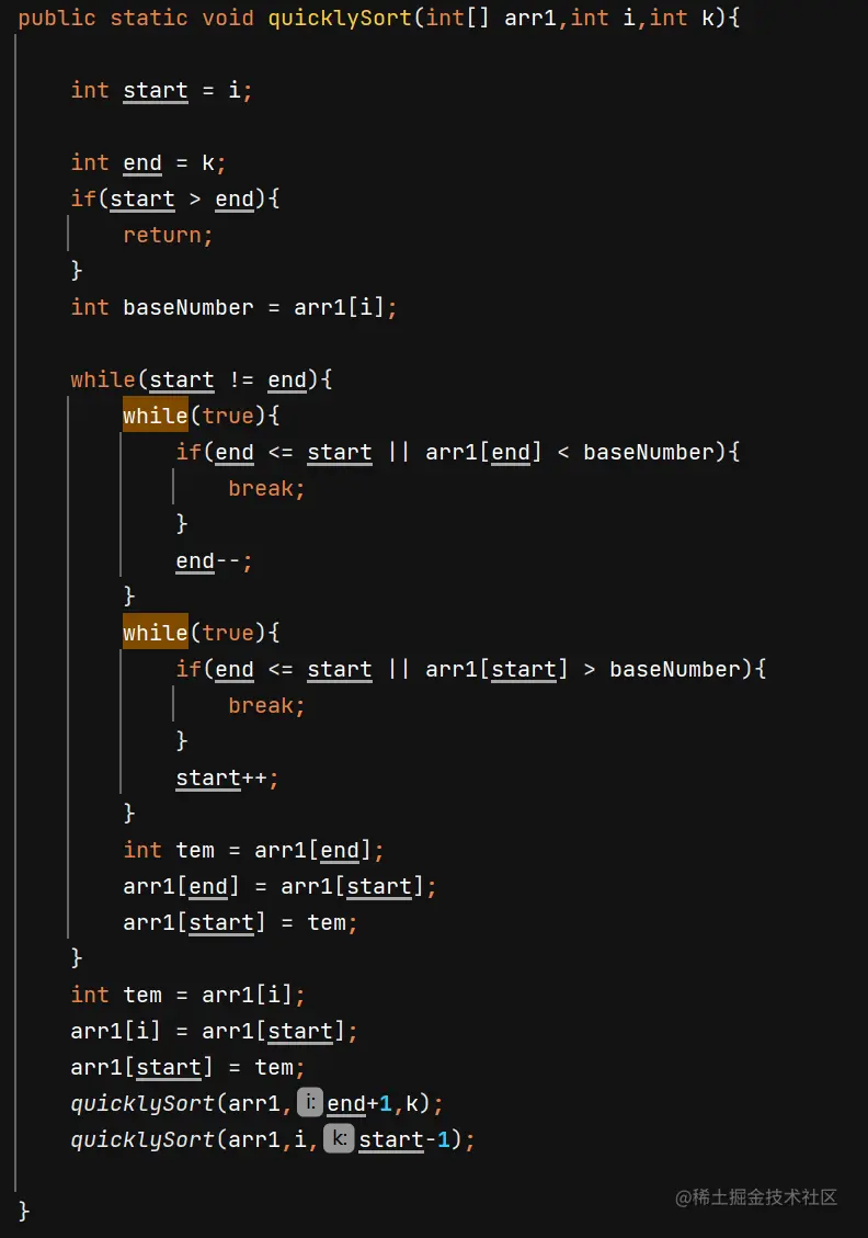 if(start > end)作为递归结束的判断。值得注意的是要先从后向前找,再从前向后找。因为当(start == end)时,要把start 位置的数字和起始索引交换,如果先从前往后查找那么当(start == end)时所在位置的值是大于索引值的,再进行交换时会导致原起始索引位置的值大于交换后的基准值,不符合我们目的(把比基准数小的放前面,大的放后面)。通过递归不断调用从而实现从小到大的排序。