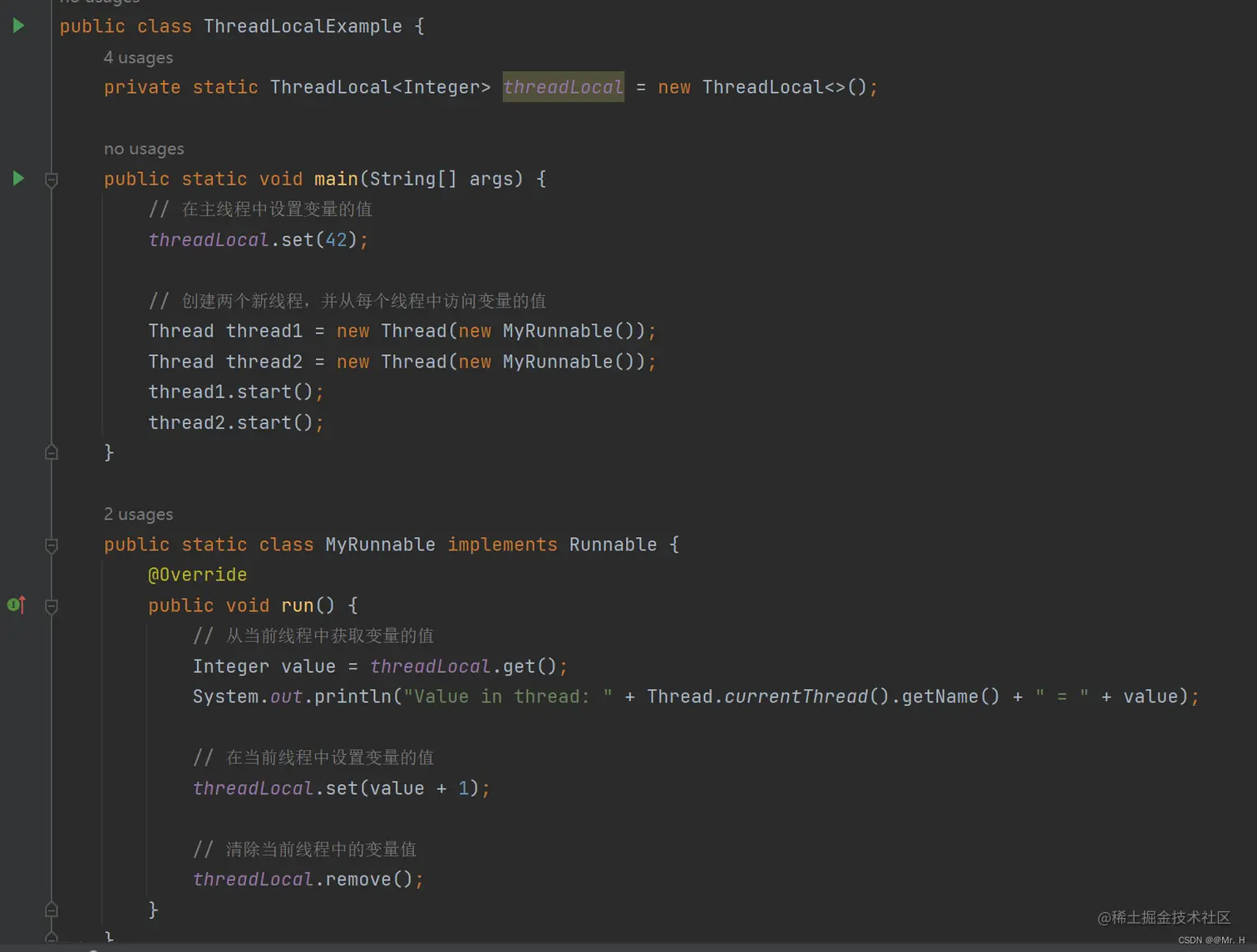 在上面的示例中,ThreadLocal 对象 ThreadLocal 用于存储整数变量的副本。主线程设置了变量的初始值为 42,然后创建了两个新线程,每个线程都从自己的副本中获取变量的值,并进行操作。