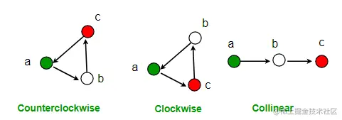 追踪当前的三个点:栈顶的下一个点、位于栈顶的点,当前分析的点points[i]。三点之间有两条连线,看作是两个向量,计算他们之间的叉积,返回三点之间的关系: