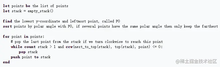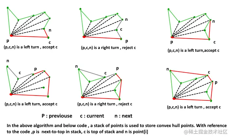 # 如果能顺时针方向(右转)连接第三个顶点,就删除栈顶元素再加入这个顶点 ; 否则(向左转才达到第三个顶点),直接加入这个顶点