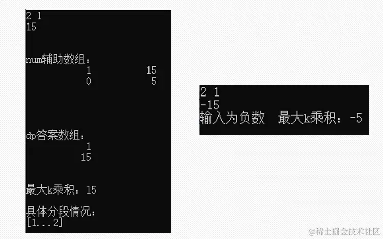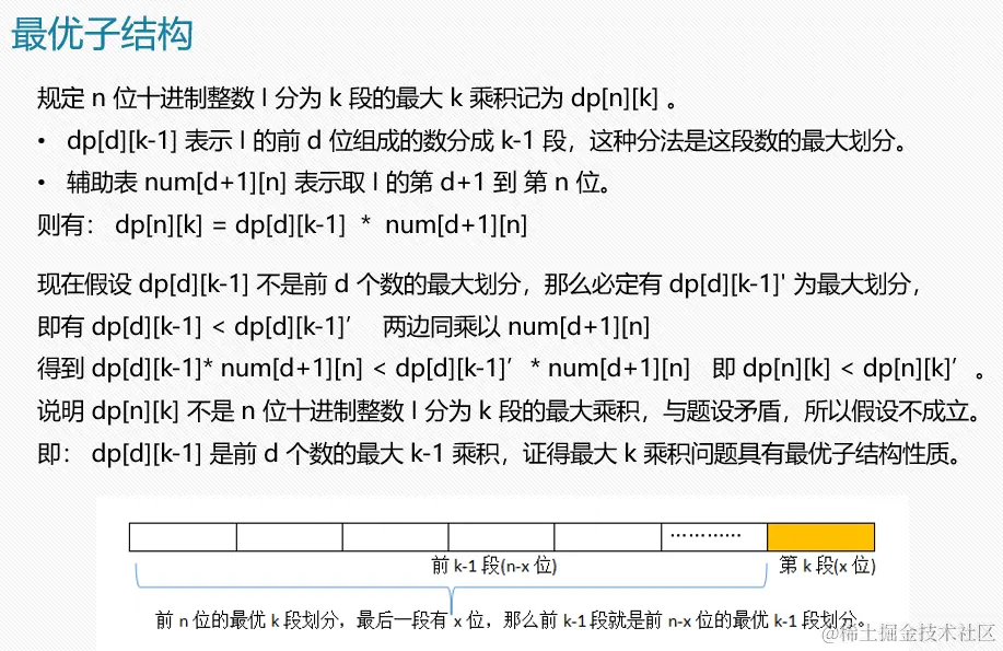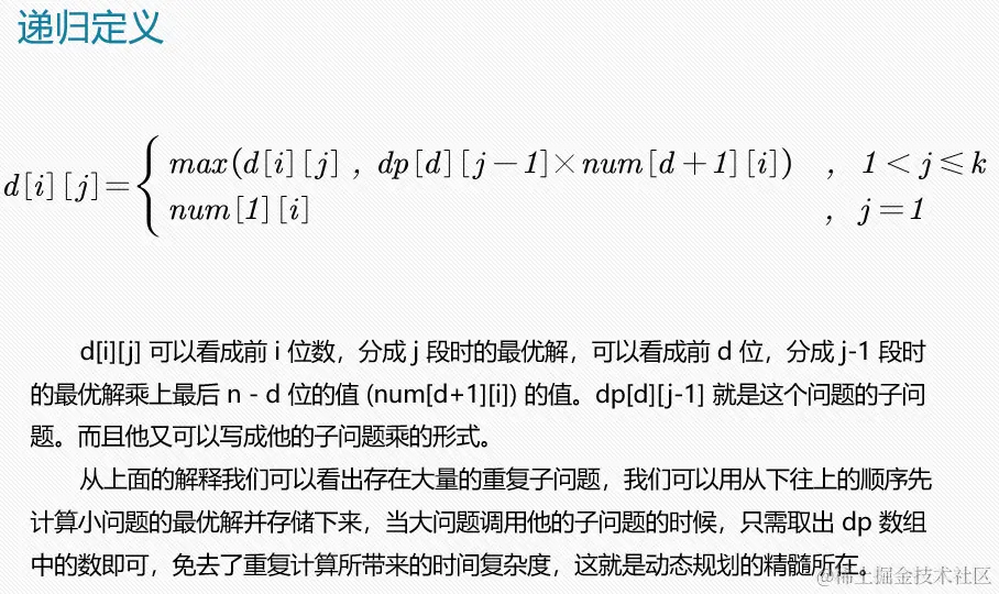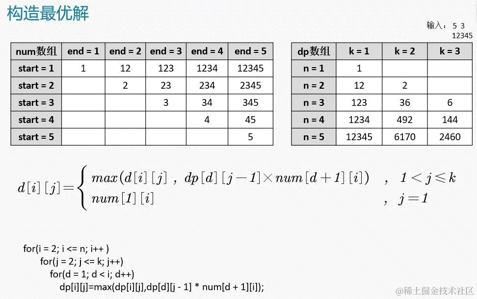 int temp = dp[d][j - 1] * num[d + 1][i]; /// dp[i][j]代表长度为i段数为j的最大乘积;num[i][j]代表第i位数到第j位数组成的数字